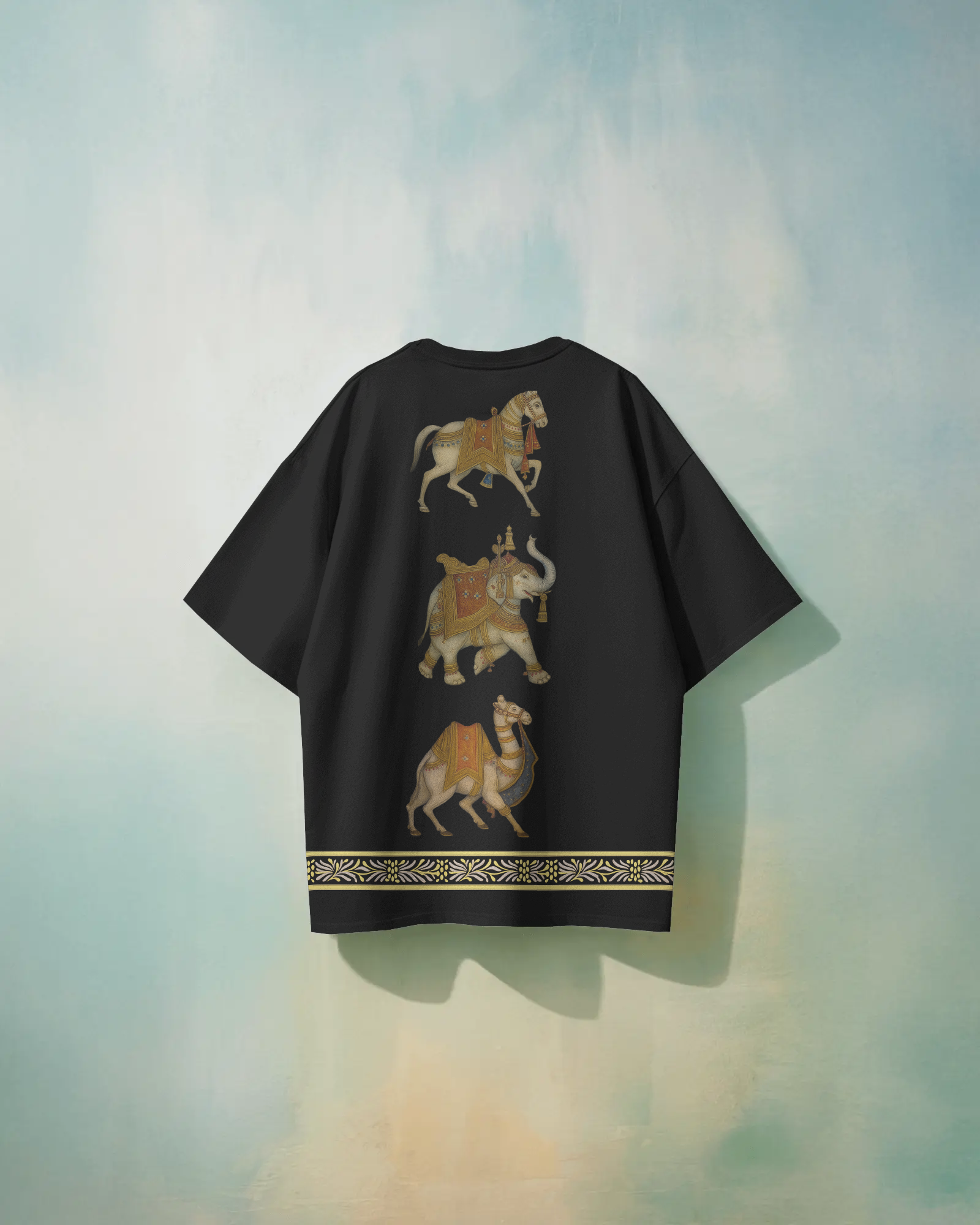 Step into timeless elegance with our Royal Caravan Oversized T-Shirt. Featuring majestic hand-painted style illustrations of a horse, elephant, and camel — the three pillars of India’s royal journeys this black oversized tee blends heritage with modern streetwear.